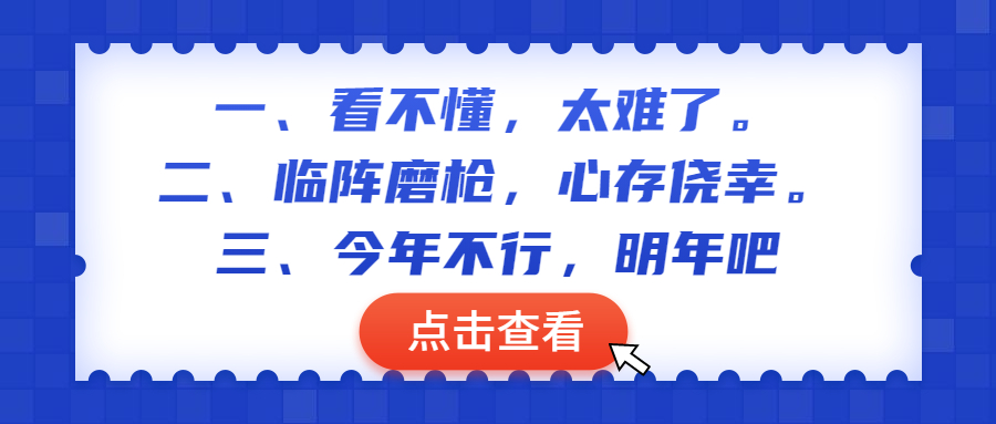 三、今年不行,明年吧!这句话几乎每个考生都对自己说过,我相信。从考场的缺考率来看就知道了,很多考生在复习到一半的时候以我没时间,我没条件等给自己找借口托到明年,可是明日复明日,明日何其多呢?