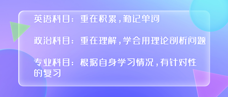 政治科目主要考四块:马克思主义哲学原理、毛泽东思想概论、邓小平理论概论、时事政治。在最后的复习阶段,要注意记忆并准确理解相关考点的基本概念和原理,这样面对题目的时候能更加从容。另外,对于时事政治这一块,考生不用刻意背很多知识点,这样会浪费很多宝贵时间,只要抓住重大事件和热点,善于利用理论剖析,拿高分就不是问题。
